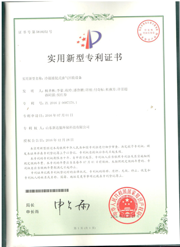 冷凝捕捉式油气回收设备证书 冷凝捕捉式油气回收设备证书